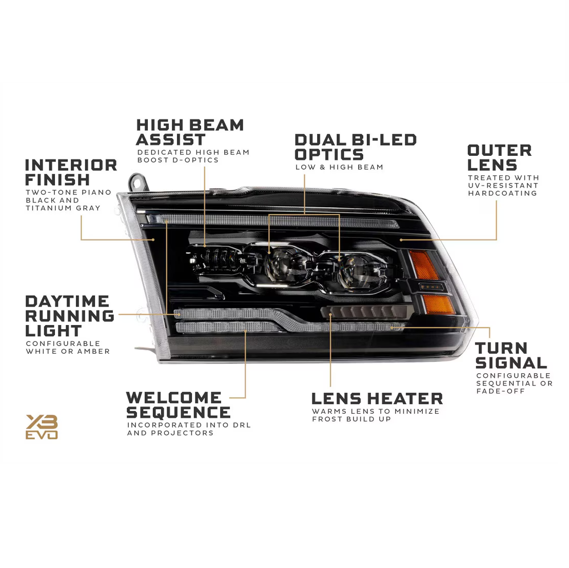 OEM Plus – When starting your Ram, the optics will automatically illuminate in a multi-stage sequence before turning back off. Unlike every other feature baked into the XB Evo headlights, this does absolutely nothing to improve performance. But executed properly, it does look cool, and there’s nothing wrong with that!