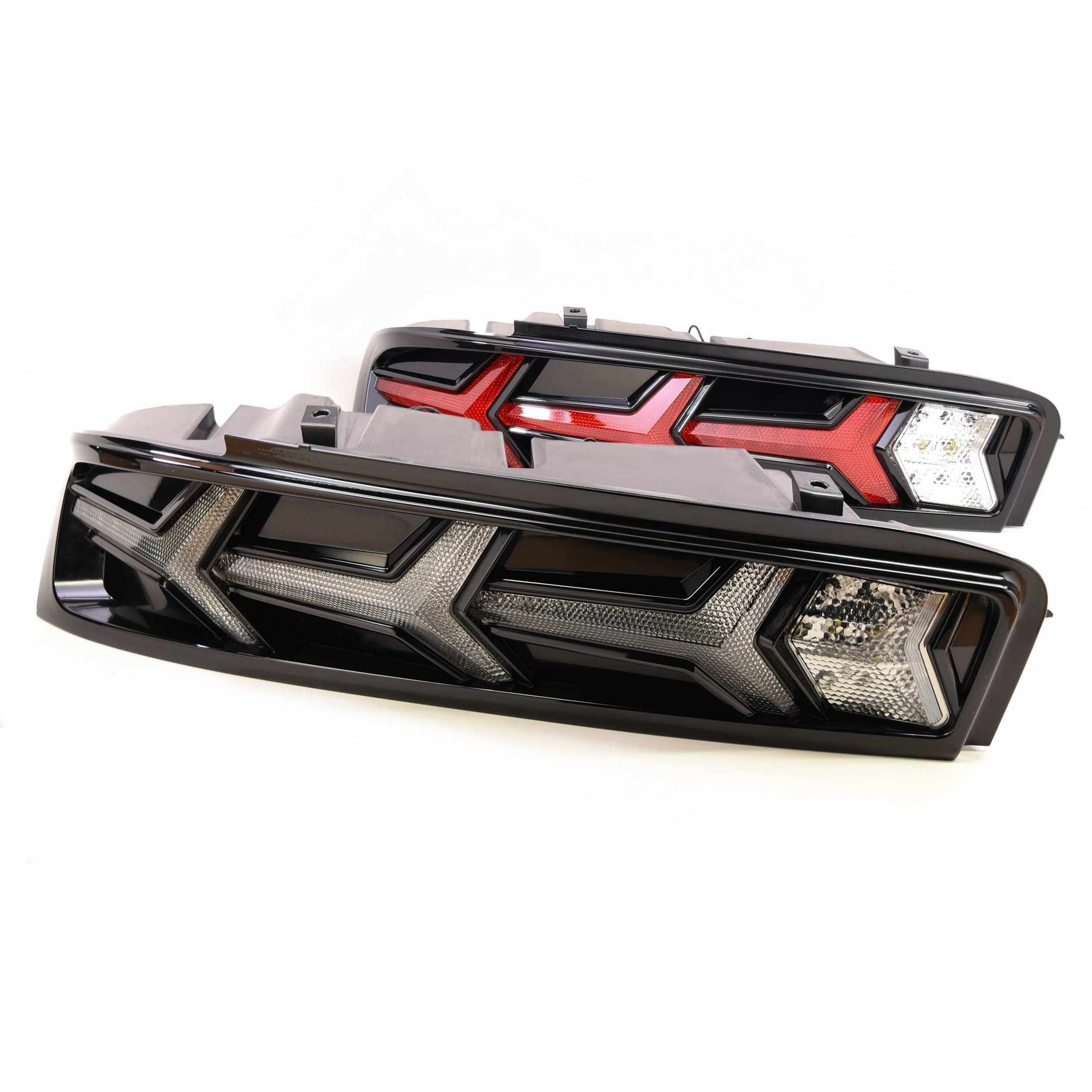 Style:Â Inspired by the Lamborghini Aventador, while they look radical, they don’t look out of place like other aftermarket options. The piano black finish matches the OEM trunk trim perfectly. The geometry flows with the body lines like a boss. The XB LED tails for your Camaro are available with either a smoked or red lens. Both will illuminate red.