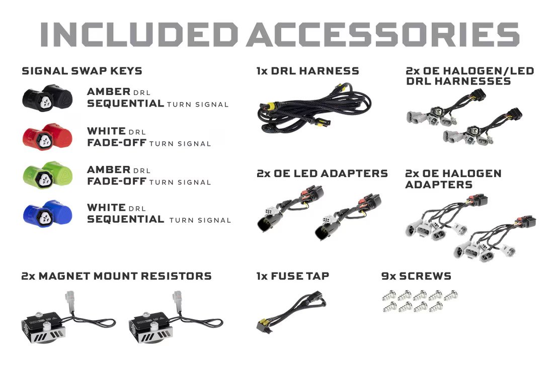 LED DRL – The turn signals and daytime running lights illuminate glass-like TIR-optics with special surface textures, which enables maximum intensity from all viewing angles. Easily out-shining low-tech DRL optics found in most every other aftermarket headlight, they also provide a one-off look with the bespoke topographic pattern etched into the sidewall.