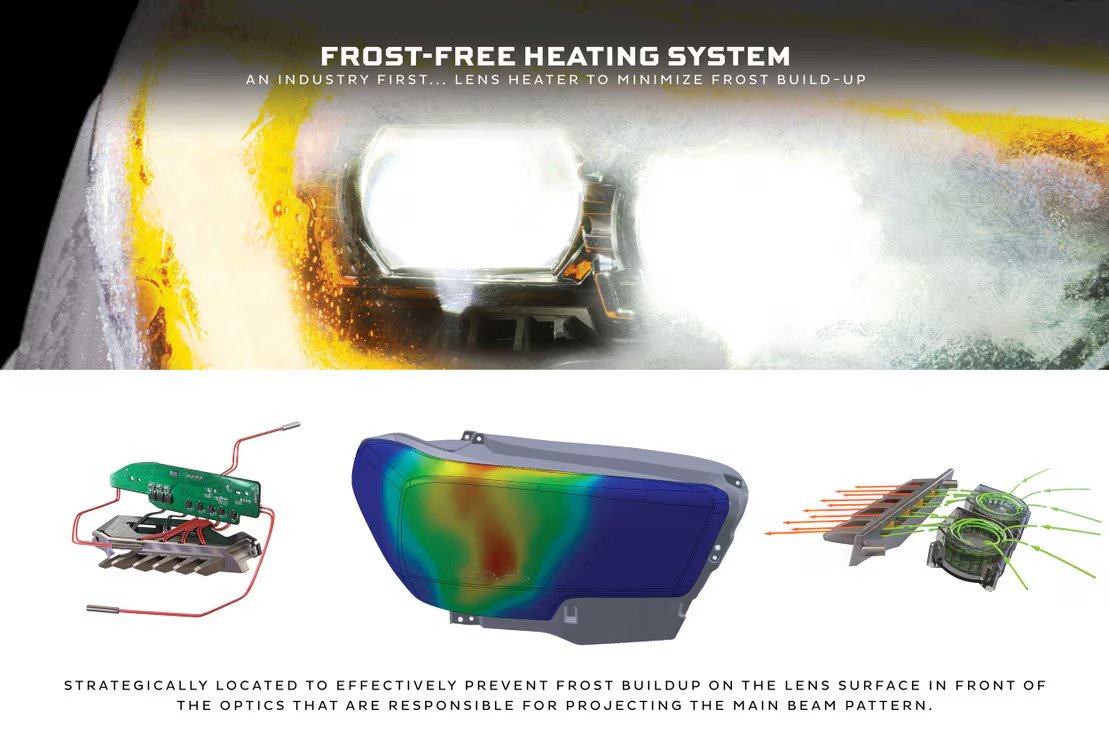 Frost Free – Our patent-pending heating system warms the surface temperature of the headlight lens to minimize frost buildup when driving through wet and snowy conditions in the wintertime. When the temperature drops below 5C/41F, the system is enabled to operate on your command by flashing the high beams four times. The lights will confirm that the heating function is operating by flashing the high beams twice. From there, it will automatically maintain temps within the headlight housing to mitigate frost buildup on the lens. A cold-climate game changer, this feature ensures the output of your XB Evo headlights will remain strong when you need it most.