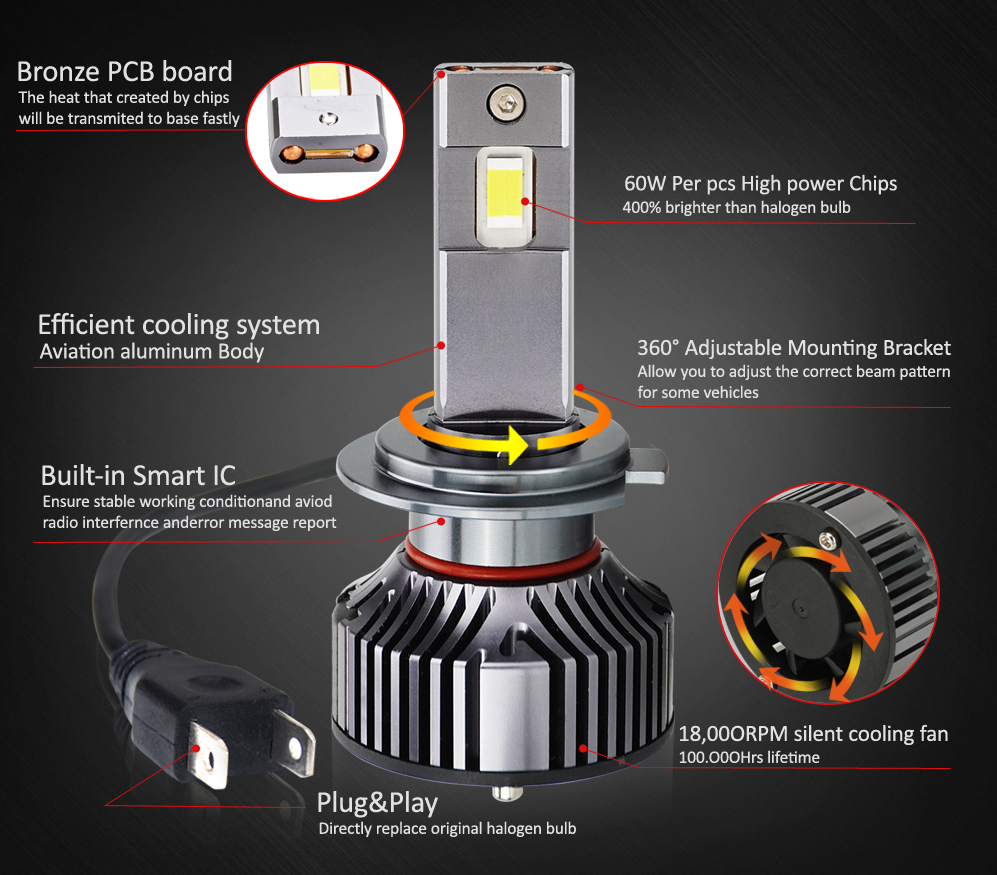Cooling – Aluminum thermal conductivity paired with an ultra quiet, highly efficient dual ball bearing cooling fan keeps LED chips cool which in turn provides over 50,000 hours of run time. Cool LED chips are key to longevity and ensuring the most efficiency out of these LED bulbs.