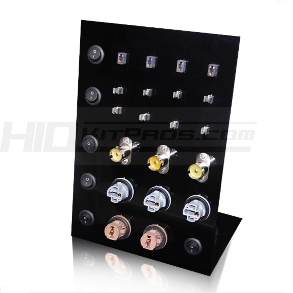 Show customers the difference in colors, brightness, compare incandescent to LED and more with the universal countertop switched display from HID Kit Pros. Included power supply makes set-up a piece of cake; simply plug in to the wall and install your LED or incandescent bulbs in each of the sockets. Each socket is individually switched to turn on or off any bulb or turn them all on at once. A necessity for store owners, trade shows, fairs and more!