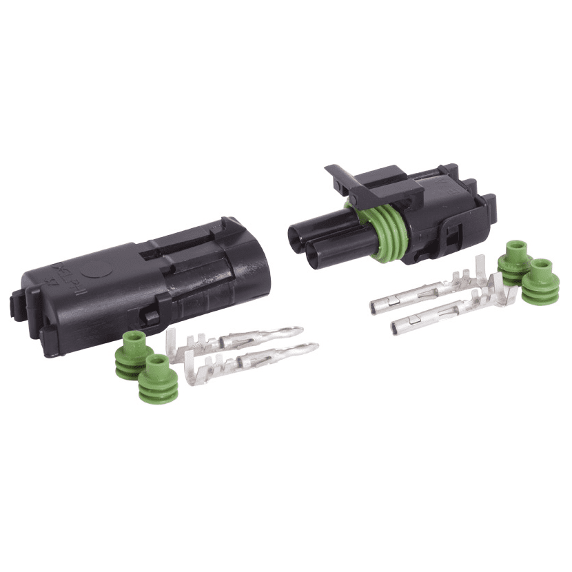 Weather Pack 2 pin connector kit are the best waterproof connections ever created, made with solid ABS plastic which are unaffected by water, chemicals or extreme temperature. The Delphi Weather Pack series connectors are the most widely used connectors in NASCAR and many other racing associations. The combination of special made housing, silicone seals, and positive locking connection makes for the best waterproof connection available.