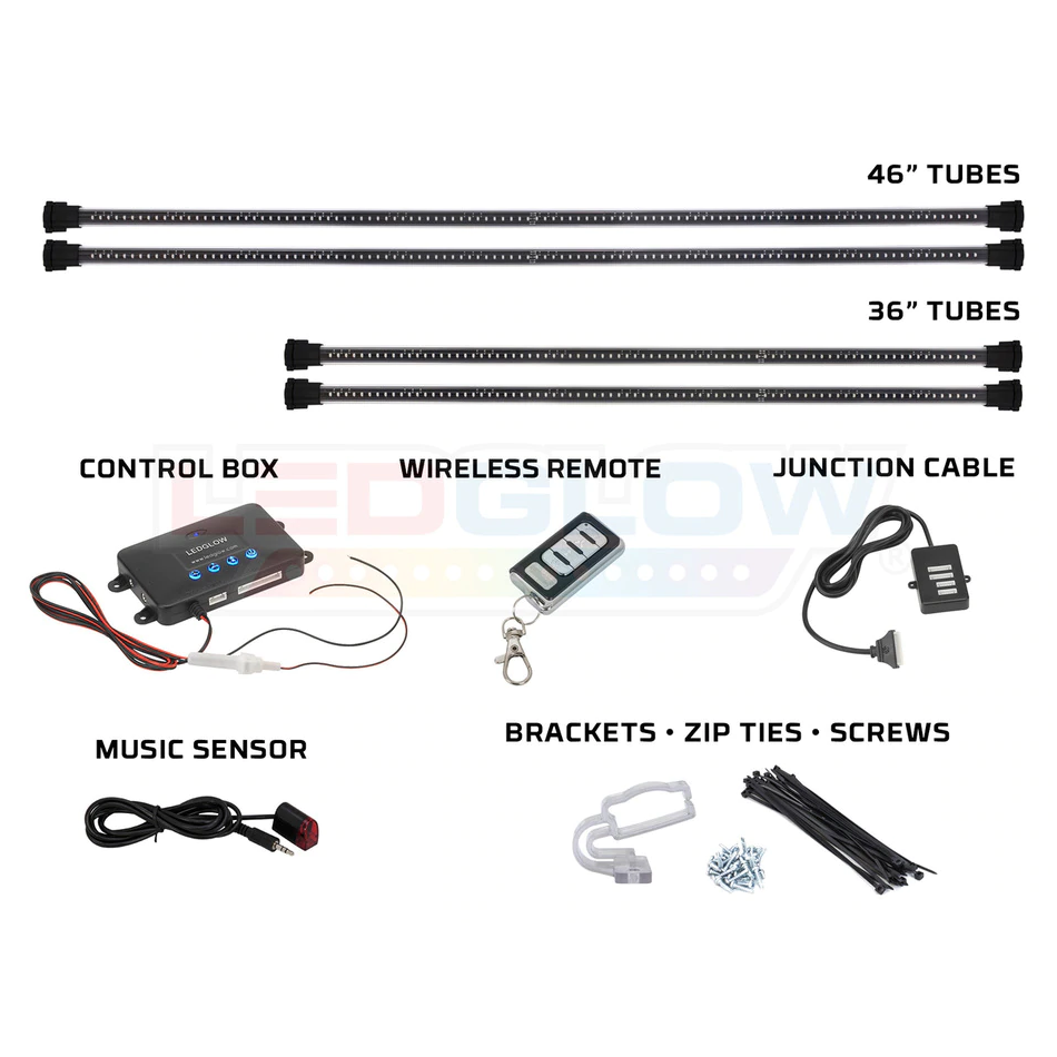 LEDGlow’s Million Color Wireless SMD LED Underbody Lighting Kit adds vibrant and spotless illumination to the underside of your car using 378 ultra-bright wide-angle 3528 SMD LEDs which project 270 degrees of lighting. These under car LED lights include (2) 46” and (2) 36” high-impact water-resistant acrylic tubes which emit 18 different solid color options combined with multiple lighting effects for a completely custom lighting experience. Each car underglow tube features a light and thin design and is easy to mount using the provided screws, zip ties and 15° angled mounting brackets. Each tube comes with extended wire lengths — 18’ for the rear underbody tube and 13’ for all other tubes — so that you’ll have no trouble running them to the included Underbody Junction Cable. Easily attach each tube to the junction cable via modular connectors. Once each tube is in place and power connections have been made your underglow lighting kit will be ready for use with all features available via the kit’s control box and wireless remote.